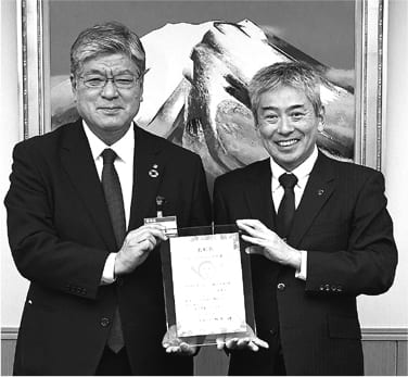 受賞表彰式にて坂本健板橋区長(左)と亀石弘司代表社員(右)